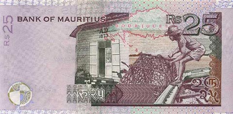 Маврикийская рупия. Купюра номиналом в 25 MUR, реверс.