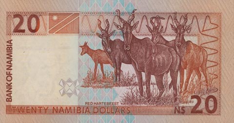 Доллар Намибии. Купюра номиналом в 20 NAD, реверс.