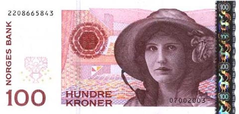 Норвежская крона. Купюра номиналом в 100 NOK, аверс.