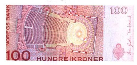 Норвежская крона. Купюра номиналом в 100 NOK, реверс.