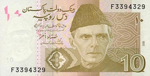 Пакистанская рупия. Купюра номиналом в 10 PKR, аверс.
