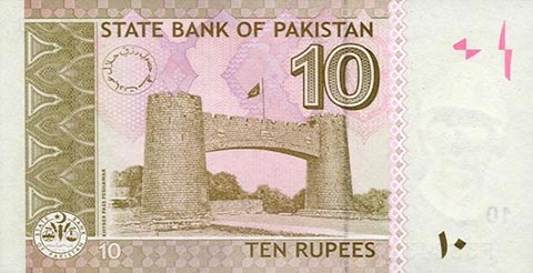 Пакистанская рупия. Купюра номиналом в 10 PKR, реверс.