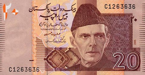 Пакистанская рупия. Купюра номиналом в 20 PKR, аверс.