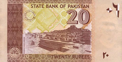 Пакистанская рупия. Купюра номиналом в 20 PKR, реверс.