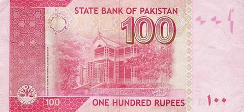 Пакистанская рупия. Купюра номиналом в 100 PKR, реверс.
