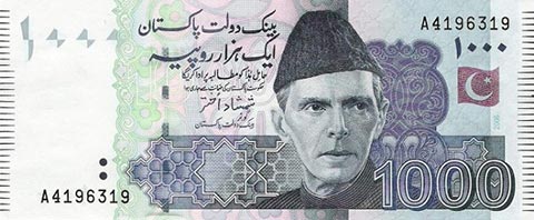 Пакистанская рупия. Купюра номиналом в 1000 PKR, аверс.
