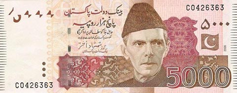 Пакистанская рупия. Купюра номиналом в 5000 PKR, аверс.