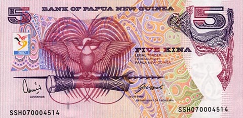 Кина П-Нов гвинея. Купюра номиналом в 5 PGK, аверс.