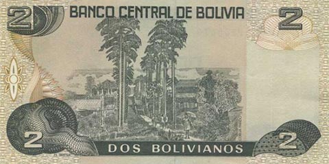 Боливийский боливиано. Купюра номиналом в 2 BOB, реверс.