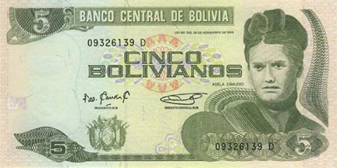 Боливийский боливиано. Купюра номиналом в 5 BOB, аверс.