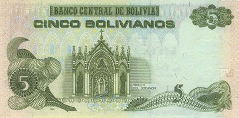 Боливийский боливиано. Купюра номиналом в 5 BOB, реверс.