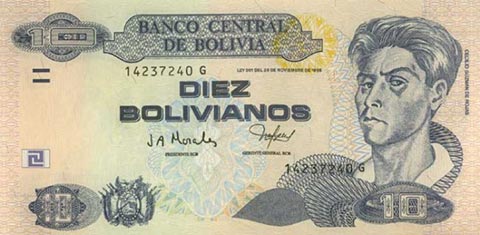 Боливийский боливиано. Купюра номиналом в 10 BOB, аверс.