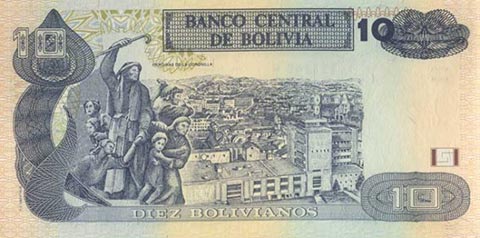 Боливийский боливиано. Купюра номиналом в 10 BOB, реверс.