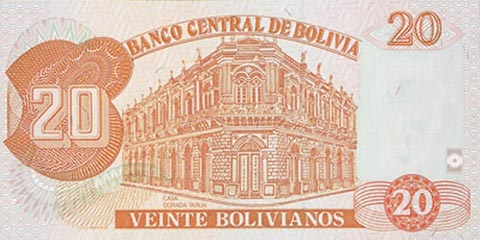 Боливийский боливиано. Купюра номиналом в 20 BOB, реверс.