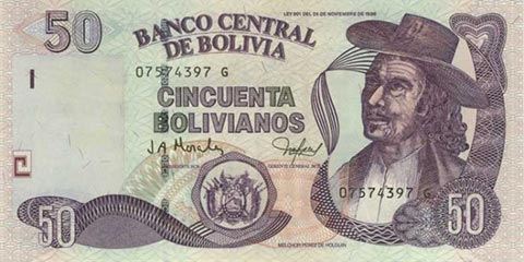 Боливийский боливиано. Купюра номиналом в 50 BOB, аверс.