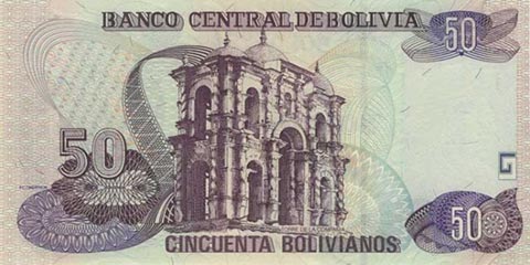 Боливийский боливиано. Купюра номиналом в 50 BOB, реверс.