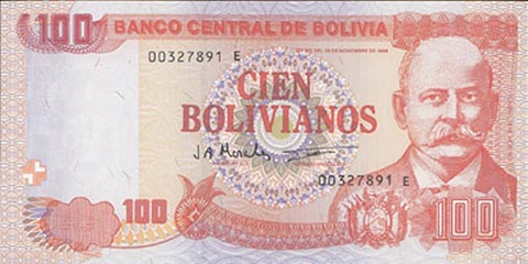 Боливийский боливиано. Купюра номиналом в 100 BOB, аверс.
