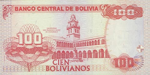 Боливийский боливиано. Купюра номиналом в 100 BOB, реверс.
