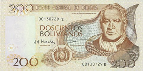 Боливийский боливиано. Купюра номиналом в 200 BOB, аверс.