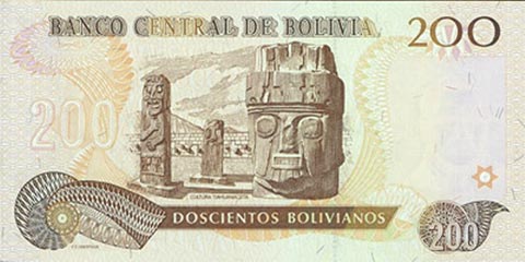Боливийский боливиано. Купюра номиналом в 200 BOB, реверс.