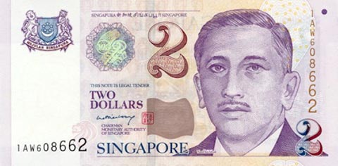 Сингапурский доллар. Купюра номиналом в 2 SGD, аверс.