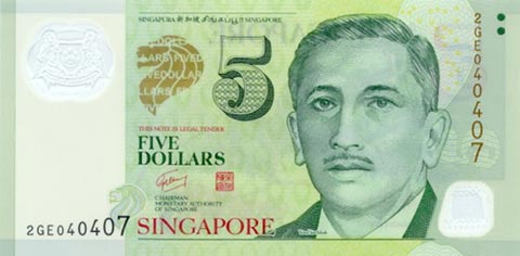 Сингапурский доллар. Купюра номиналом в 5 SGD, аверс.