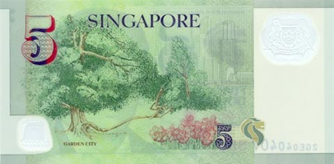 Сингапурский доллар. Купюра номиналом в 5 SGD, реверс.