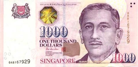 Сингапурский доллар. Купюра номиналом в 1000 SGD, аверс.
