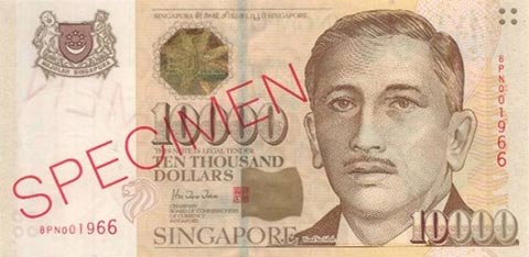 Сингапурский доллар. Купюра номиналом в 10000 SGD, аверс.