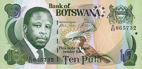 Ботсванская пула. Купюра номиналом в 10 BWP, аверс.