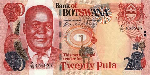 Ботсванская пула. Купюра номиналом в 20 BWP, аверс.