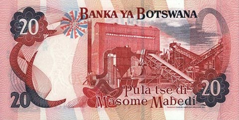 Ботсванская пула. Купюра номиналом в 20 BWP, реверс.