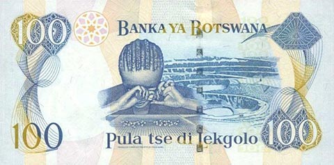 Ботсванская пула. Купюра номиналом в 100 BWP, реверс.