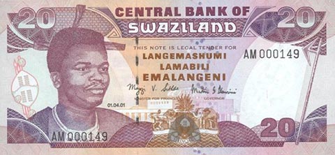 Свазилендский лилангени. Купюра номиналом в 20 SZL, аеверс.