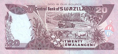 Свазилендский лилангени. Купюра номиналом в 20 SZL, реверс.