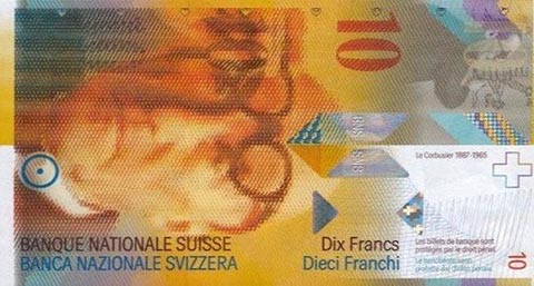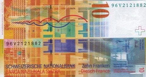Швейцарский франк. Купюра номиналом в 10 CHF, реверс.