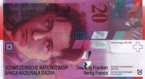 Швейцарский франк. Купюра номиналом в 20 CHF, аверс.