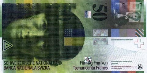 Швейцарский франк. Купюра номиналом в 50 CHF, реверс.