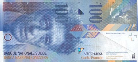 Швейцарский франк. Купюра номиналом в 100 CHF, реверс.