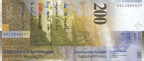 Швейцарский франк. Купюра номиналом в 200 CHF, реверс.