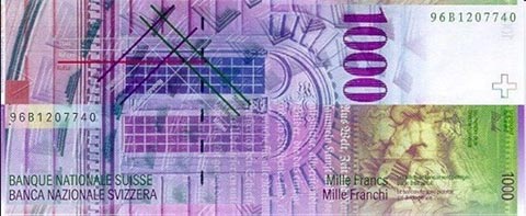 Швейцарский франк. Купюра номиналом в 1000 CHF, реверс.