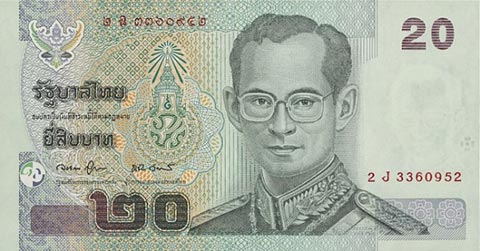 Тайладнский бат. Купюра номиналом в 20 THB, аверс.