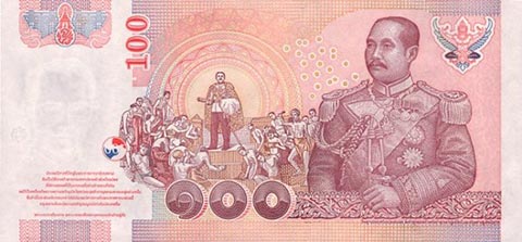 Тайладнский бат. Купюра номиналом в 100 THB, реверс.