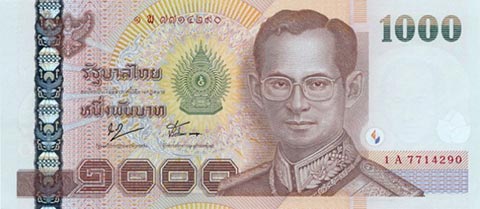 Тайладнский бат. Купюра номиналом в 1000 THB, аверс.