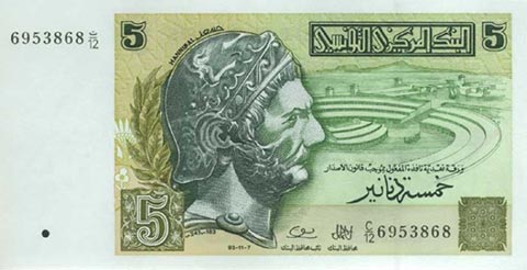 Тунисский динар. Купюра номиналом в 5 TND, аверс.