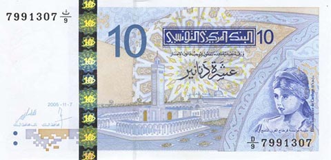 Тунисский динар. Купюра номиналом в 10 TND, аверс.