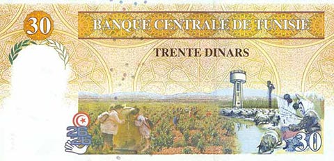 Тунисский динар. Купюра номиналом в 30 TND, реверс.