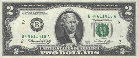 Доллар США. Купюра номиналом в 2 USD, аверс.
