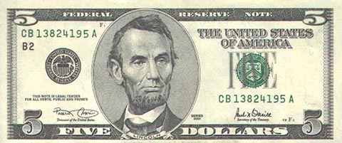 Доллар США. Купюра номиналом в 5 USD, аверс.