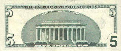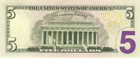 Доллар США. Купюра номиналом в 5 USD, реверс.